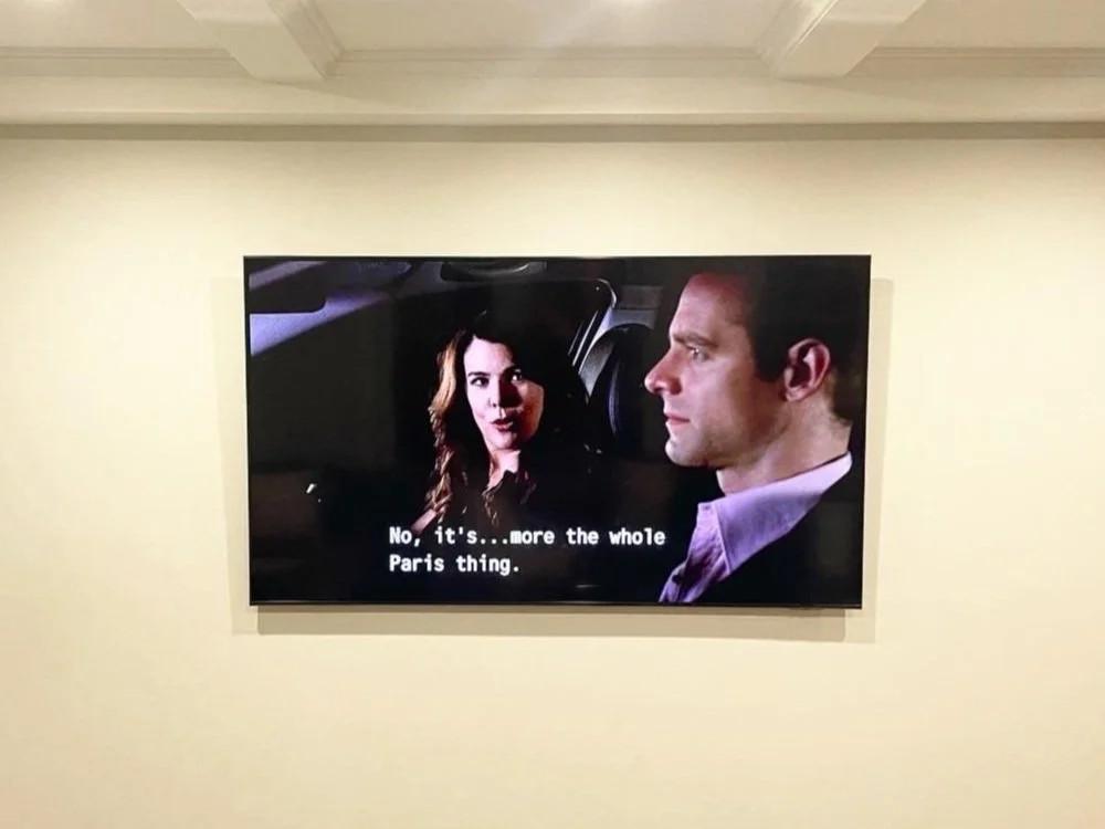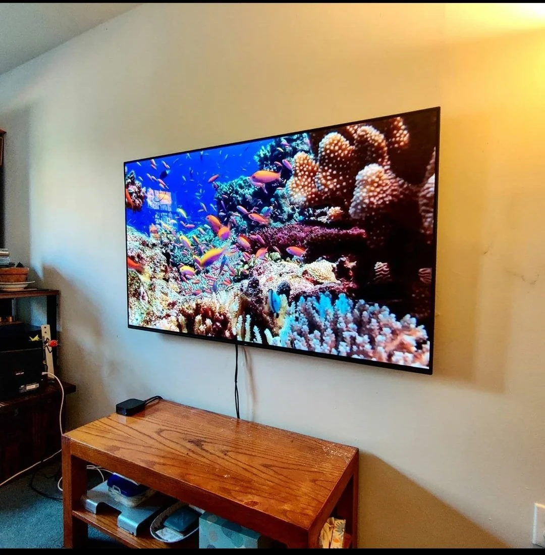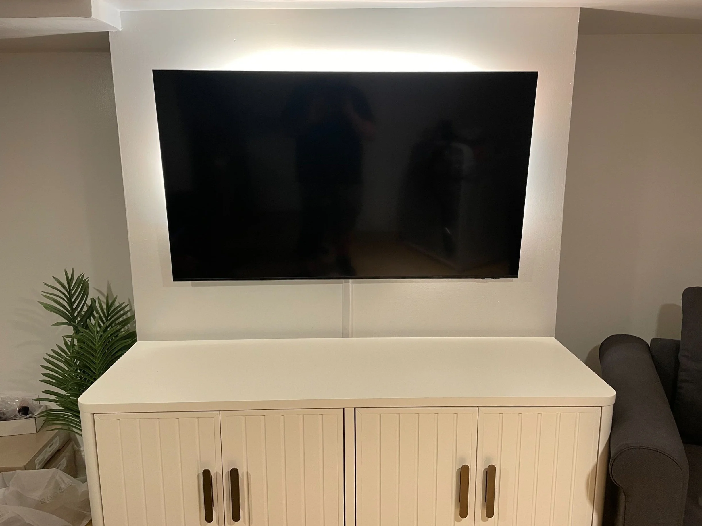 Install bracket and mount tv. Cable raceway installed to hide wires.